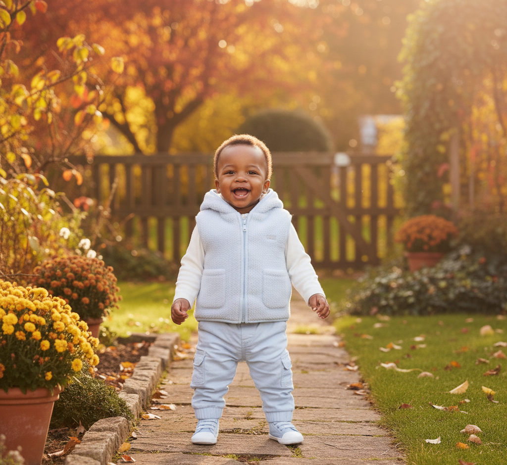Designed with both practicality and elegance in mind, the fleece gilet adds an extra layer of warmth while allowing freedom of movement. The ivory top provides a clean, classic look, and the blue cargo trousers offer durability and a trendy finish, making this set ideal for adventurous little boys.