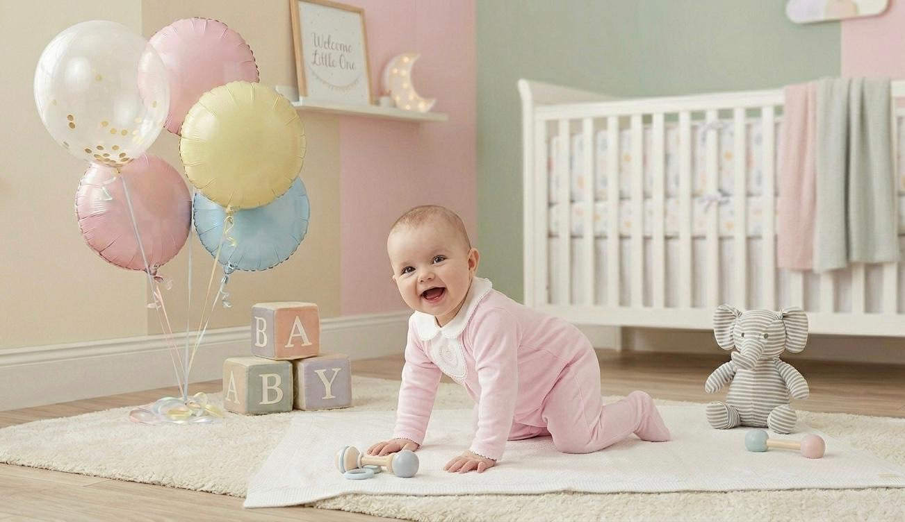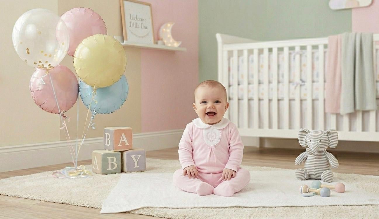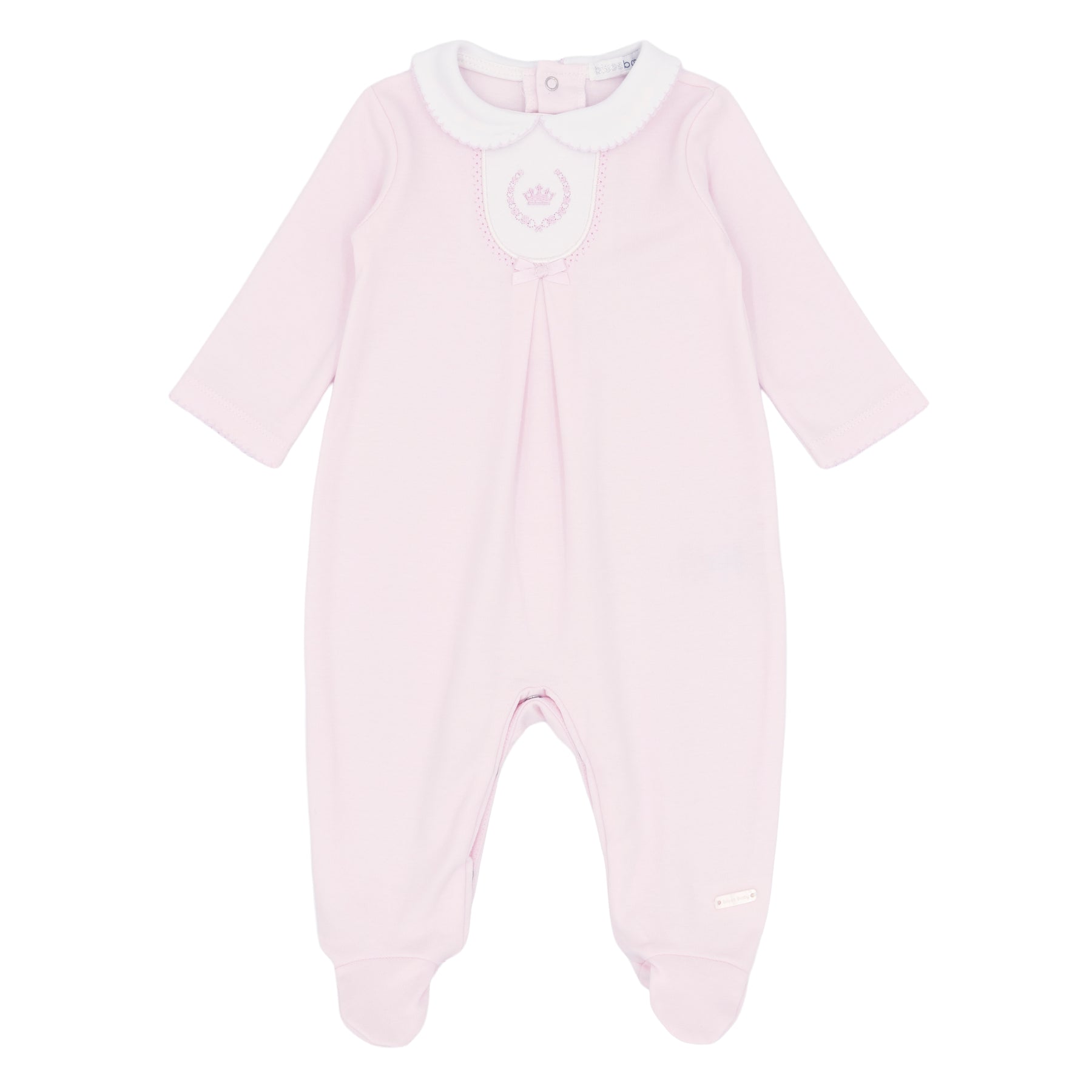 Crafted from high-quality premium cotton, this all-in-one offers a breathable and gentle fit, ideal for a newborn's sensitive skin. The standout feature is the crisp white bib-style collar, which is beautifully finished with a central pink crown and laurel wreath embroidery. A dainty pink satin bow sits just below the collar, while smart central pleating adds a structured, boutique-style feel to the garment.