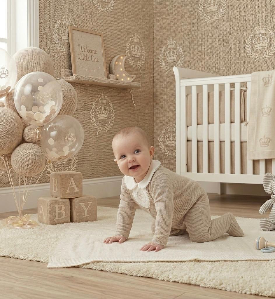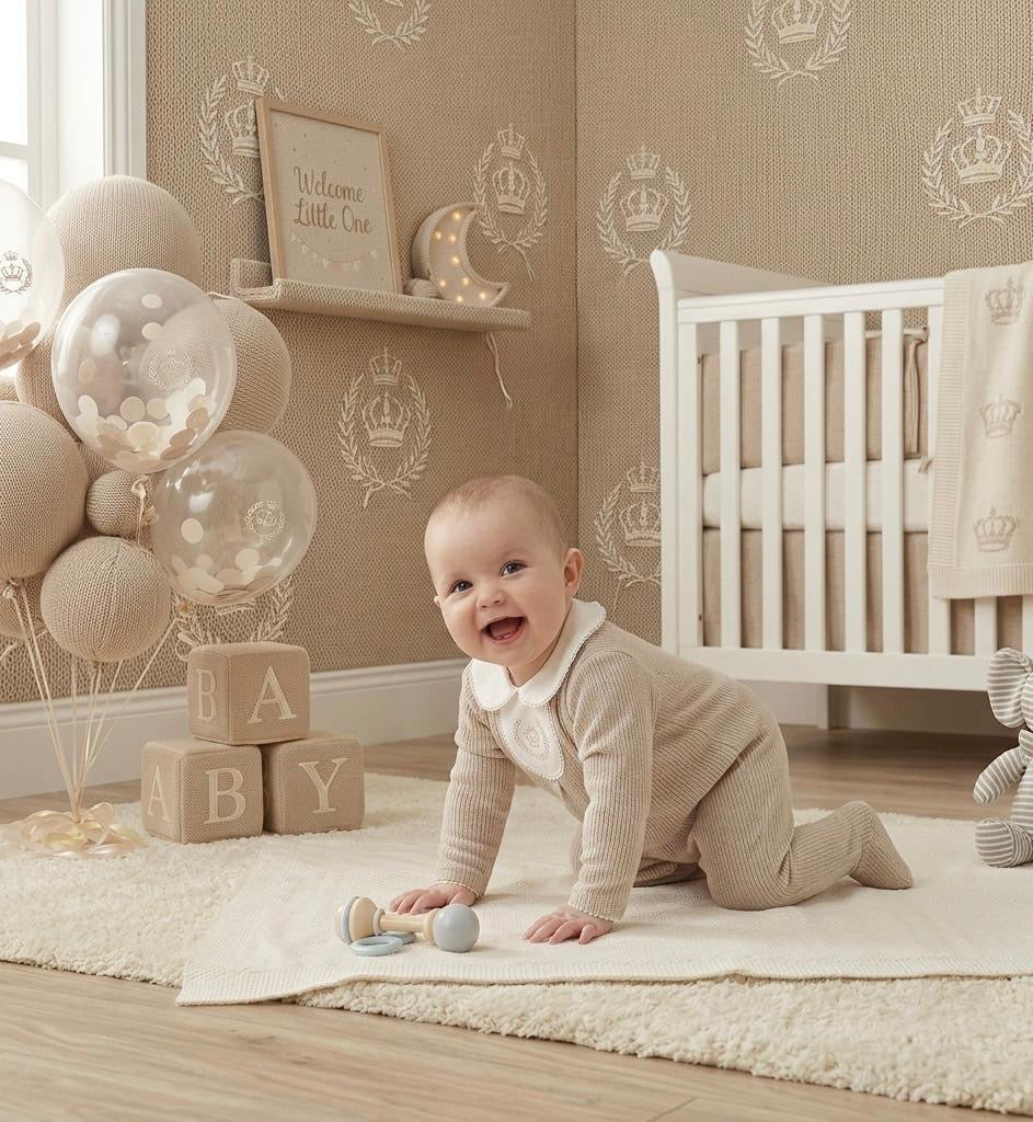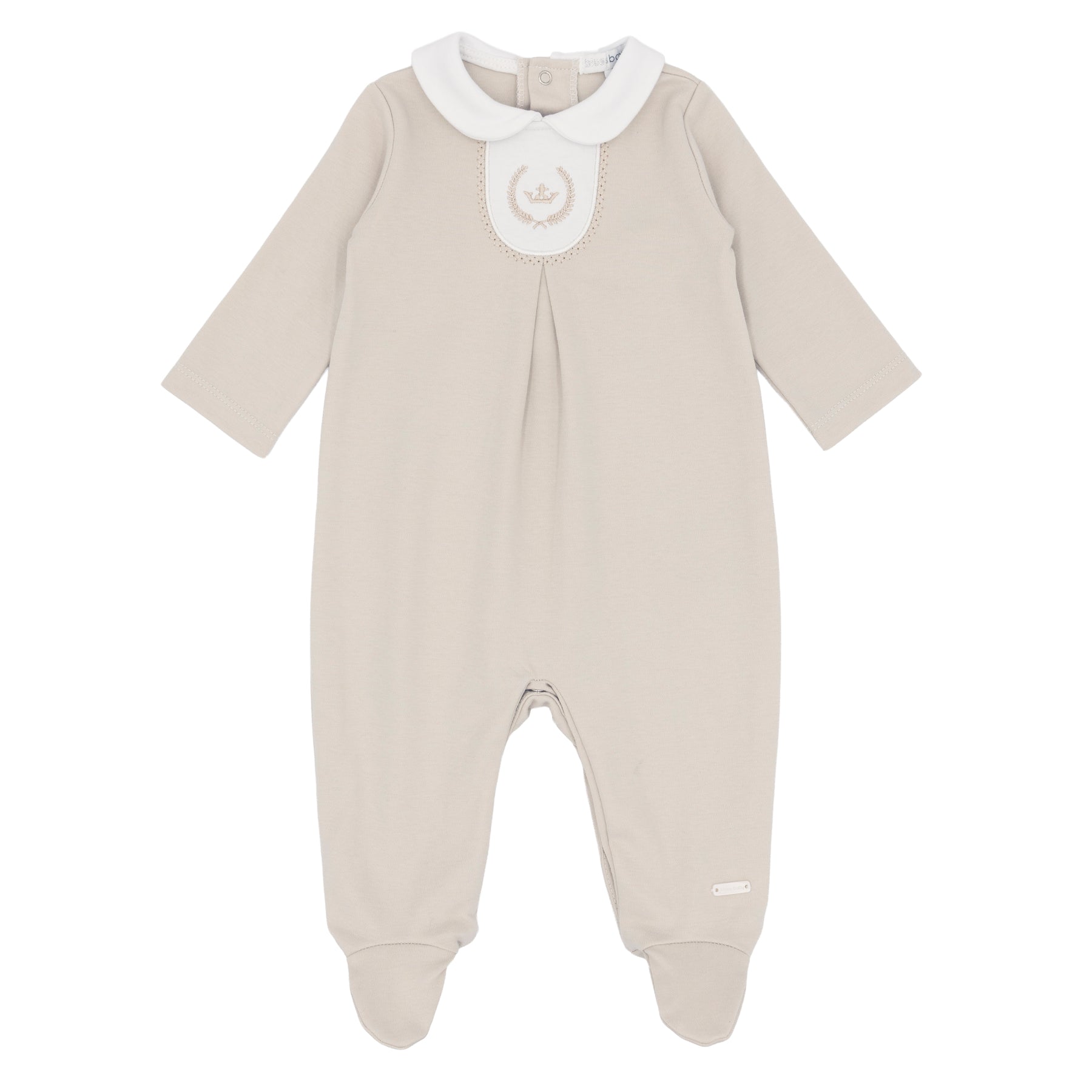 Crafted from the softest premium cotton, this all-in-one features a neutral beige body that provides a calming, high-end feel. The centrepiece is a crisp white bib-style collar, beautifully detailed with a central royal crown and laurel wreath embroidery in a subtle gold-tone thread. A delicate pleated front adds structure and a touch of formal flair, making it an exquisite choice for a coming home outfit, a newborn gift, or special occasions.