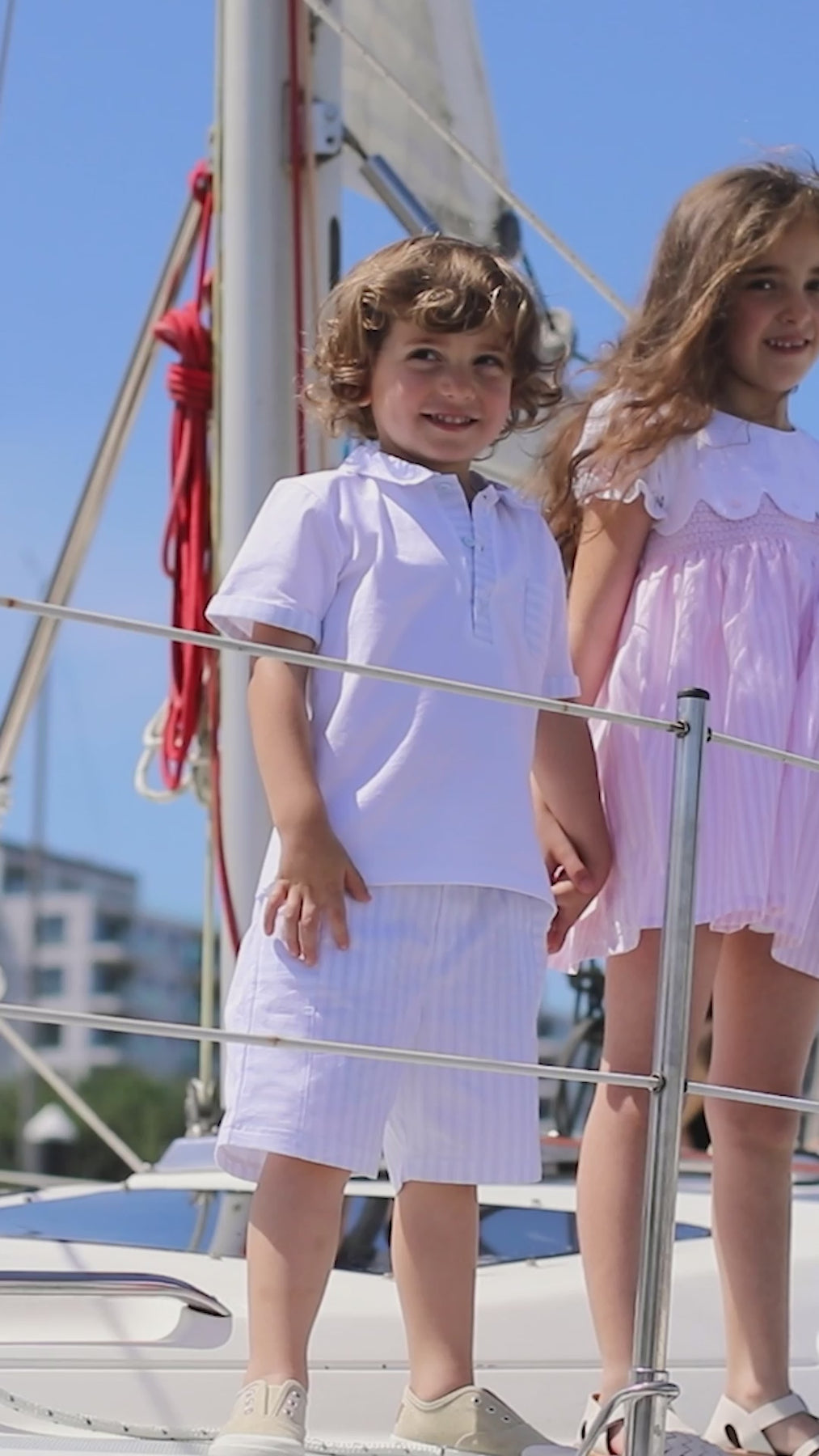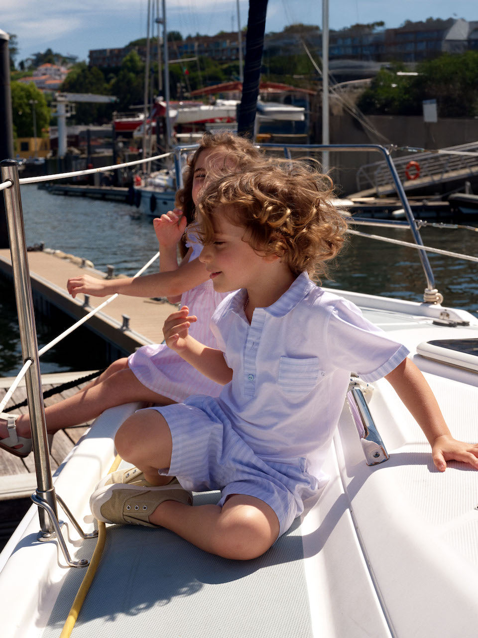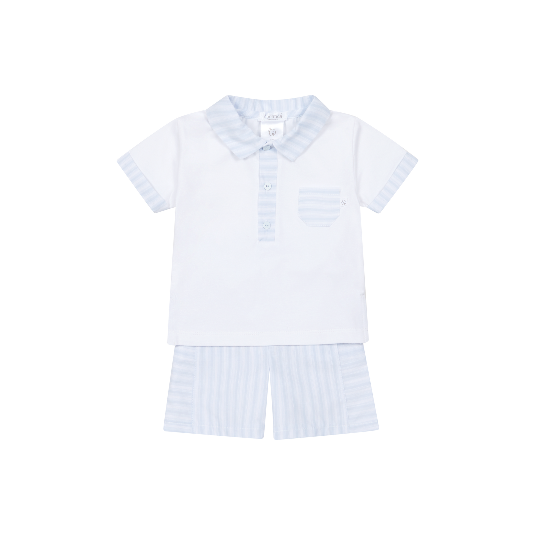This charming two-piece set from the Deolinda California Story collection is a quintessential choice for your little one’s spring and summer wardrobe. Expertly crafted in Portugal, this Deolinda set features a crisp white short-sleeved polo shirt with delicate light blue striped accents on the collar, button placket, and chest pocket. Paired with matching vertically striped shorts, this ensemble offers a timeless, clean look that is perfect for family holidays, summer parties, or smart-casual weekend outings. The soft, breathable fabric used by Deolinda ensures maximum comfort for active boys while maintaining that sought-after boutique finish.