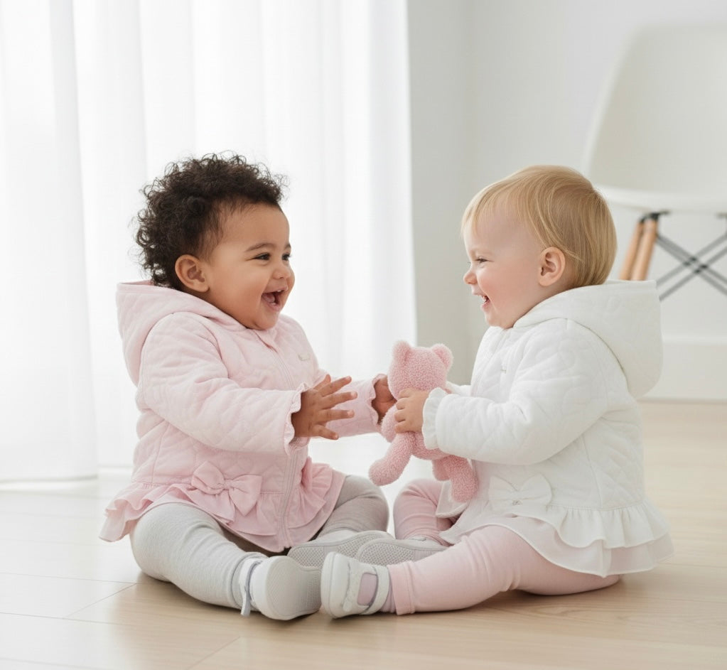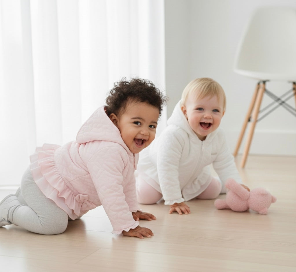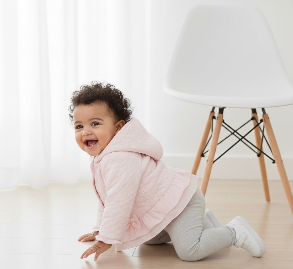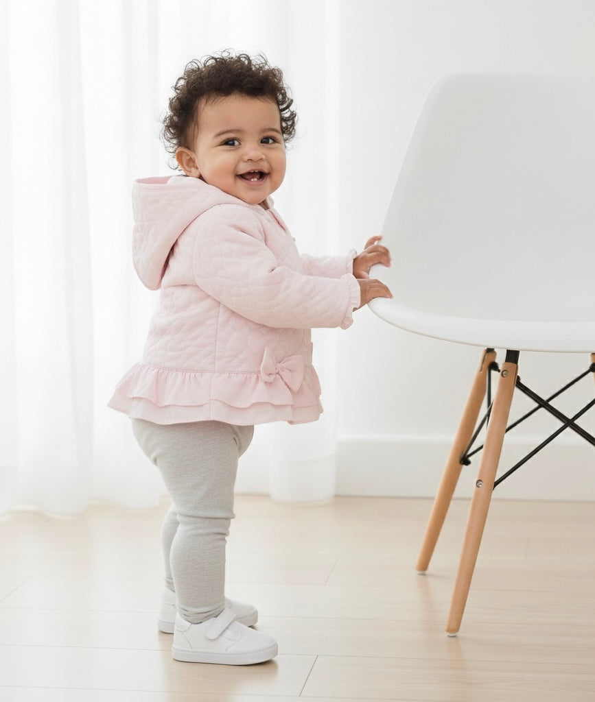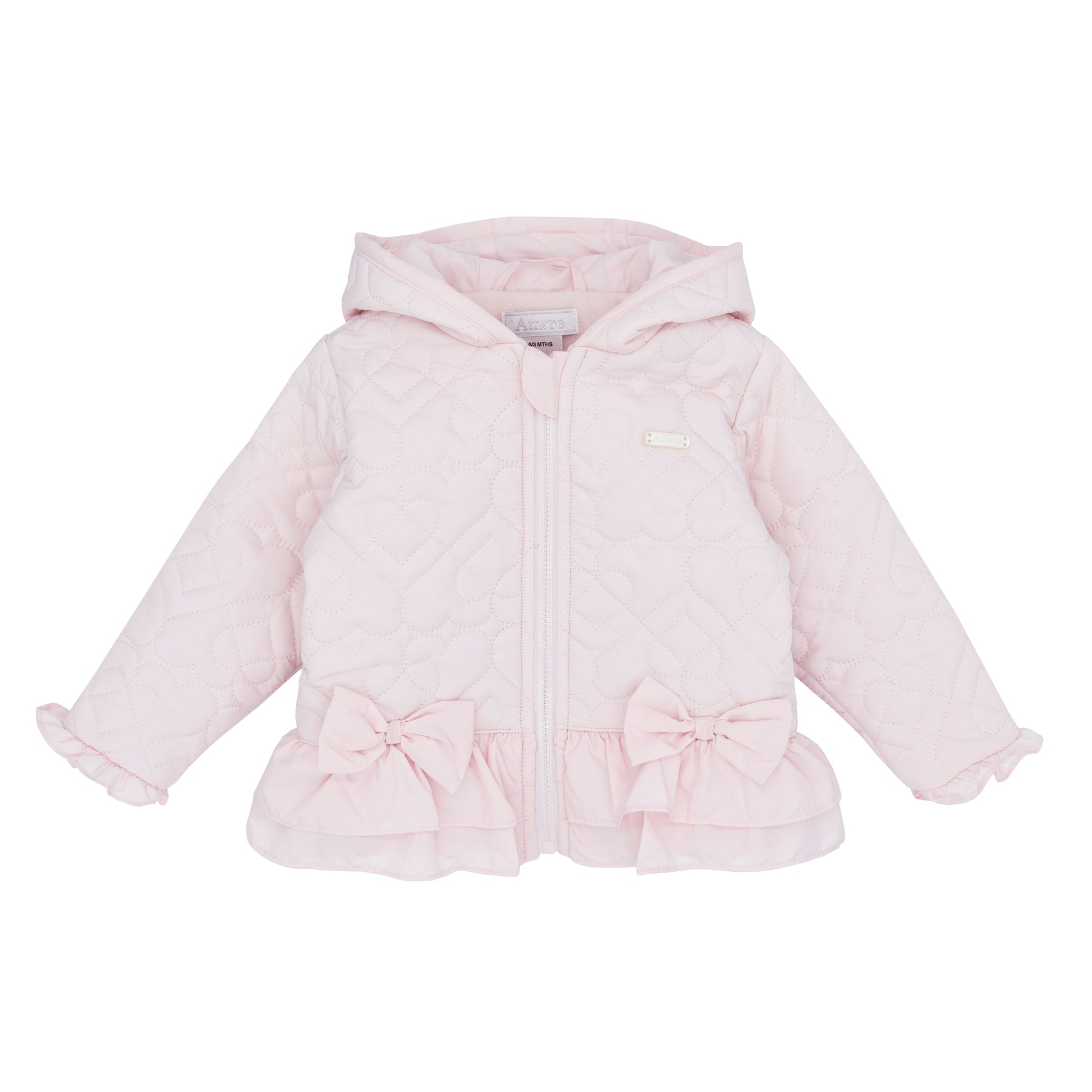 Keep your little girl cosy and stylish with this girls’ pink quilted hooded jacket from Amore. Part of the Autumn Winter collection, it features a warm quilted design, a comfy hood, and charming details including two bows at the waistline, zip fastening, and ruffle-trimmed cuffs. Available in sizes 0-3 months up to 4 years, this jacket combines practicality and boutique style, making it perfect for everyday wear or special outings throughout the season.