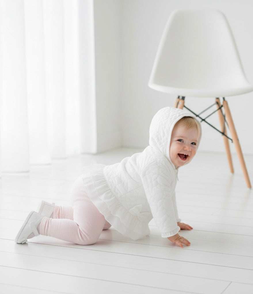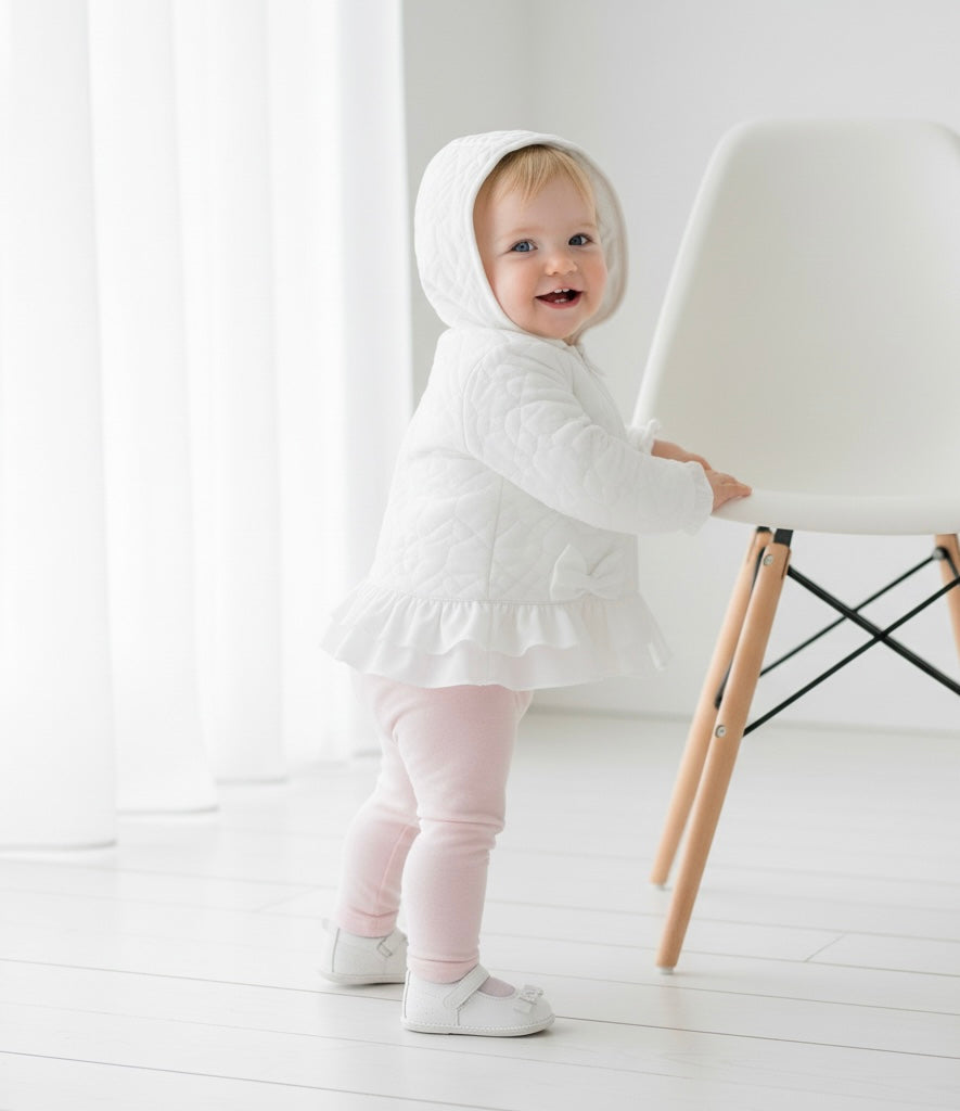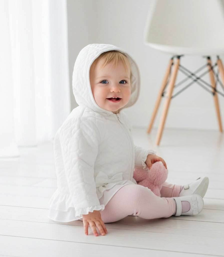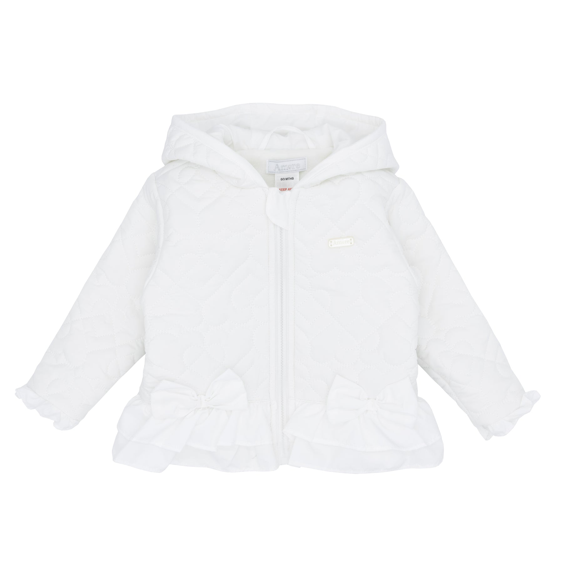 Keep your little girl cosy and stylish with this girls’ white quilted hooded jacket from Amore. Part of the Autumn Winter collection, it features a warm quilted design, a comfy hood, and charming boutique details including two bows at the waistline, zip fastening, and ruffle-trimmed cuffs. Available in sizes 0-3 months up to 4 years, this jacket combines practicality and elegance, making it perfect for everyday wear or special outings throughout the season.