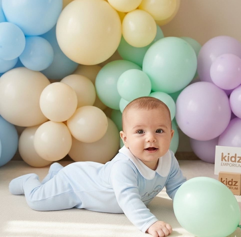 Wrap your little boy in classic boutique charm with this baby boys’ blue all-in-one from Mintini, part of the Autumn Winter collection. The soft fabric features a playful rocking horse motif on the front, while the crisp white collar adds a touch of refined detail.