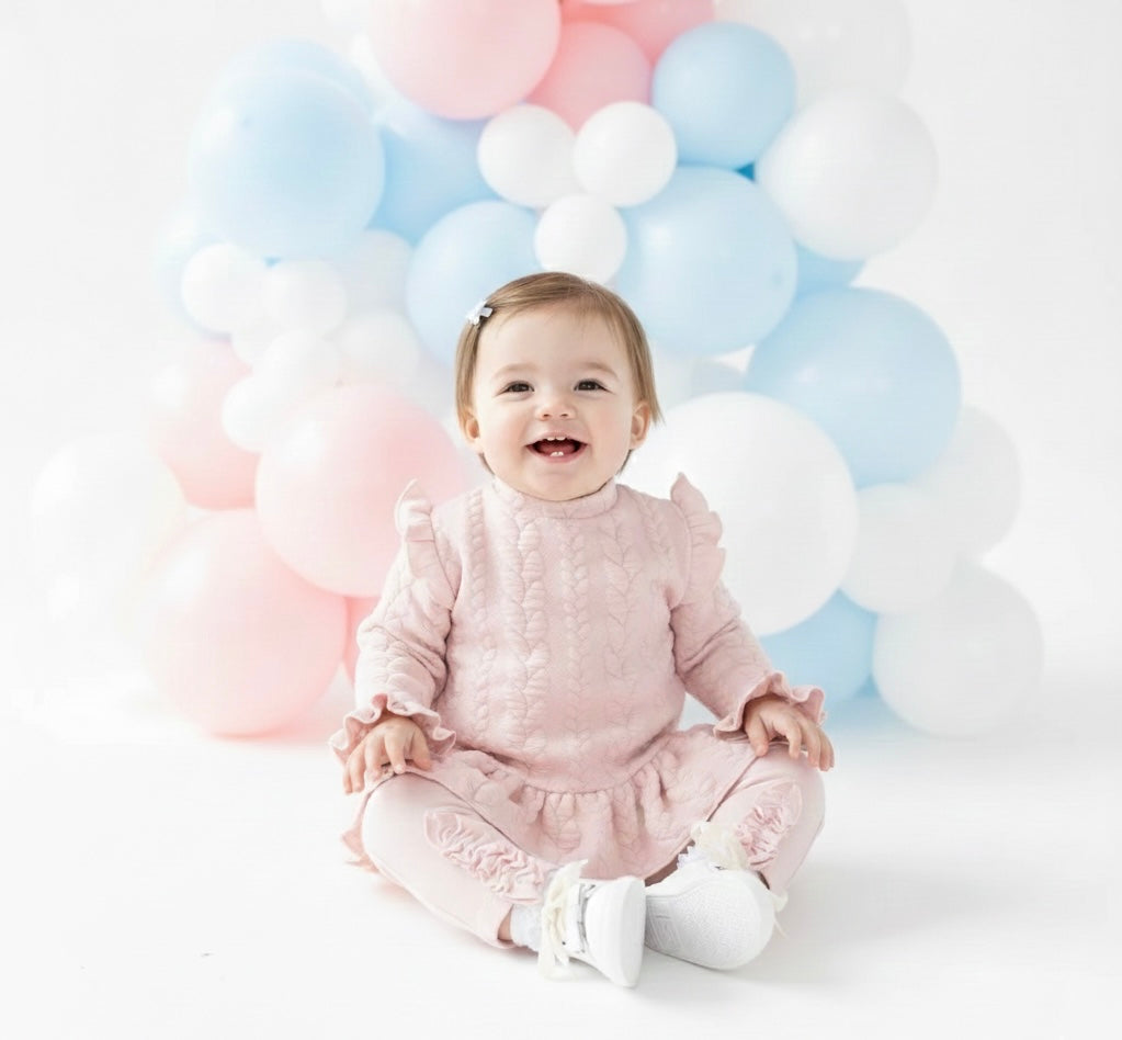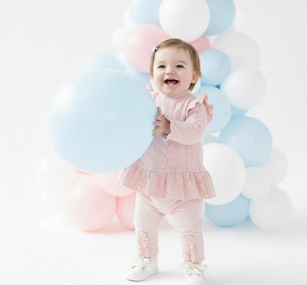 Elevate your little girl’s wardrobe with this girls’ pink aran cable tunic and legging set from Blues Baby, part of their Autumn Winter collection. The long sleeve tunic features frill details on the shoulders, cuffs, and around the bottom, paired with an elegant aran cable pattern for a stylish, boutique look. Matching leggings are finished with subtle frill trims at the ankles, completing the coordinated outfit with comfort and charm for everyday wear or special occasions.