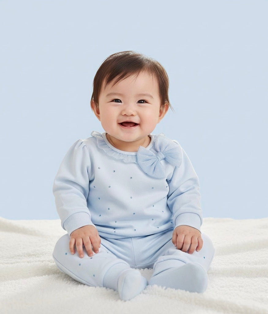 The long-sleeve top features a delicate bow at the neckline, frill cuffs, and subtle diamanté embellishments across the front for a boutique touch. Paired with the matching pale blue joggers, designed with an elasticated waistband and cuffed ankles, this set combines practicality with designer detail, making it perfect for everyday wear or special seasonal occasions.