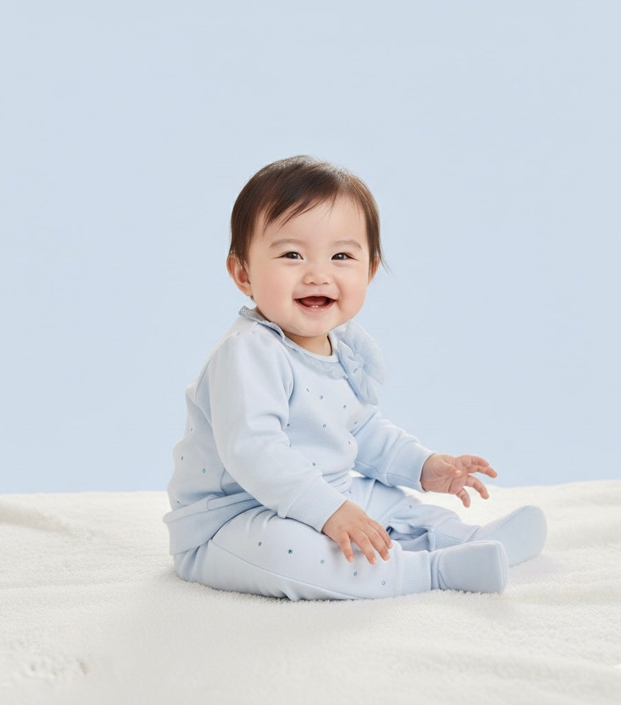 A charming outfit from Mintini, the boutique childrenswear brand renowned for its elegant and thoughtful designs. This girls’ pale blue two-piece top and jogger set is part of the Autumn Winter collection, blending cosy comfort with stylish seasonal details.