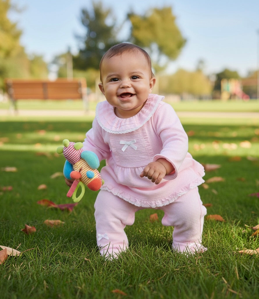 The matching pink leggings include frill details along the legs, each accented with a tiny white bow, creating a coordinated and charming ensemble. Crafted with comfort and style in mind, this set is perfect for everyday wear, family gatherings, or special occasions.