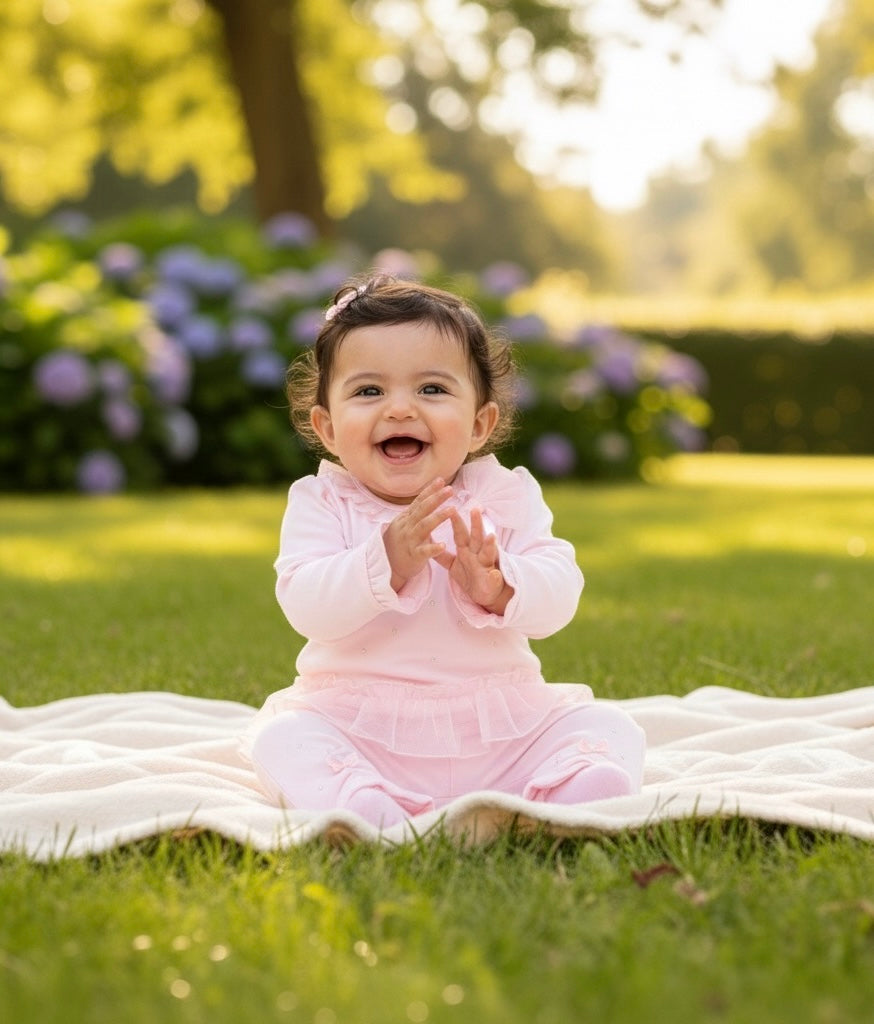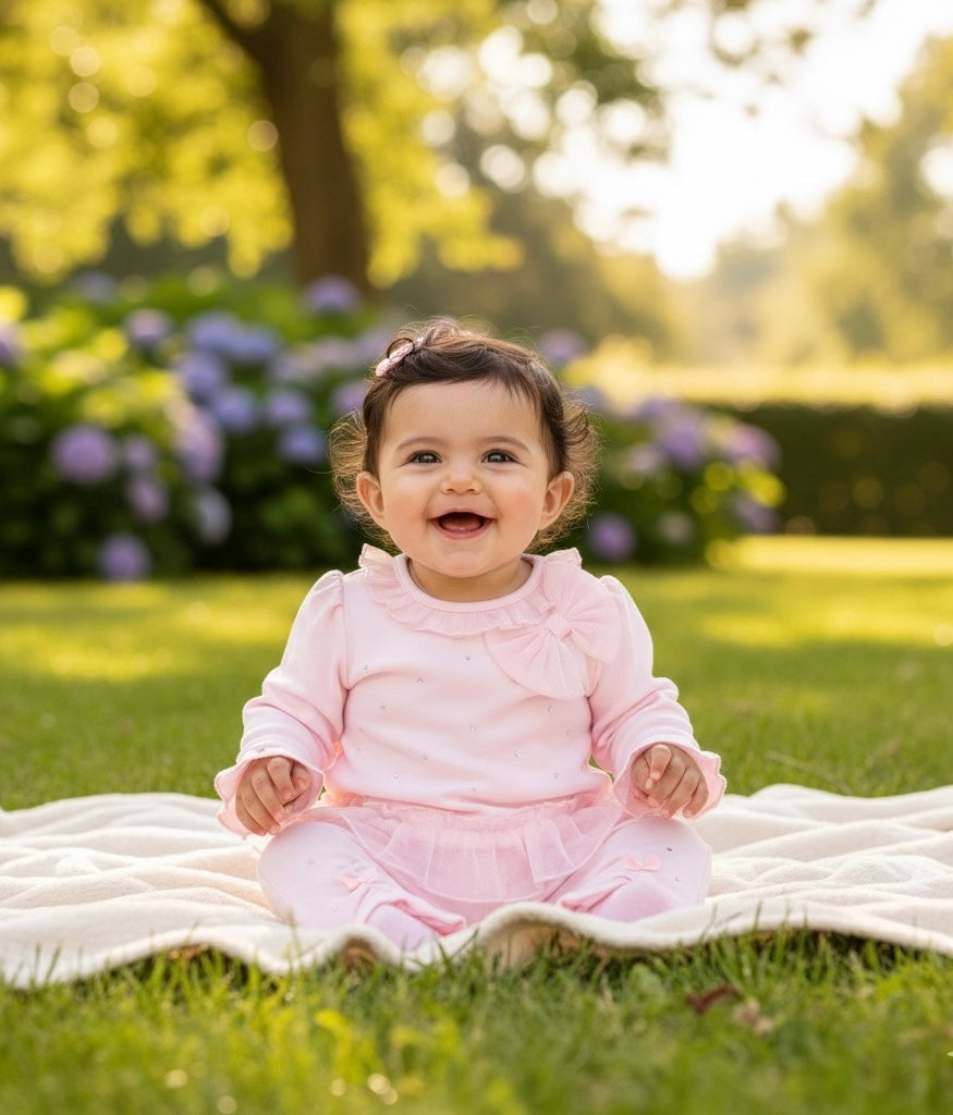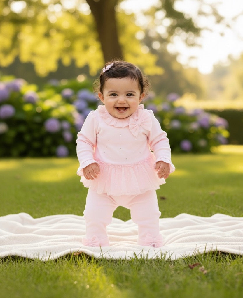 A delightful outfit from Mintini, a boutique childrenswear brand celebrated for its elegant designs. This girls’ pink two-piece set is part of the Autumn Winter collection, combining cosy comfort with stylish seasonal details.